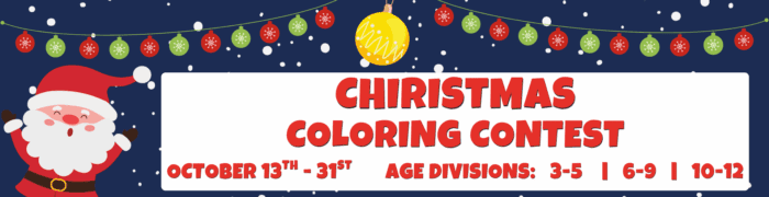 The top two winners from each age group will have their artwork featured on this year’s Christmas banner for everyone to enjoy! The banner will go up the day before Thanksgiving and be on display all season long — to the New Year!